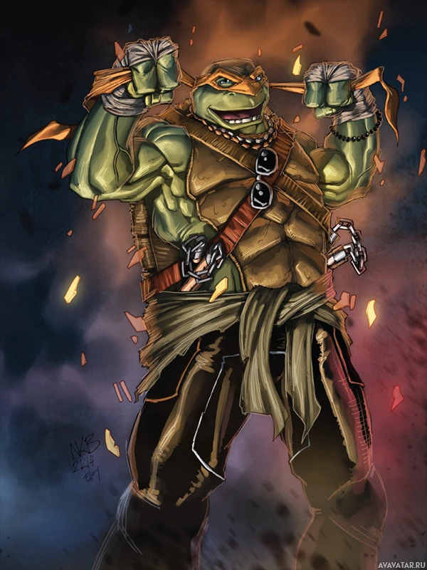 The image shows a stylized illustration of Michelangelo, one of the Teenage
