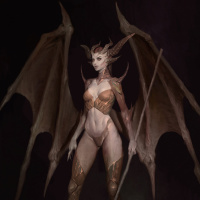 depictions of succubi in fantasy artwork. The character is also wearing armor that includes breastplate-style armor and boots, suggesting she may have some sort of magical or