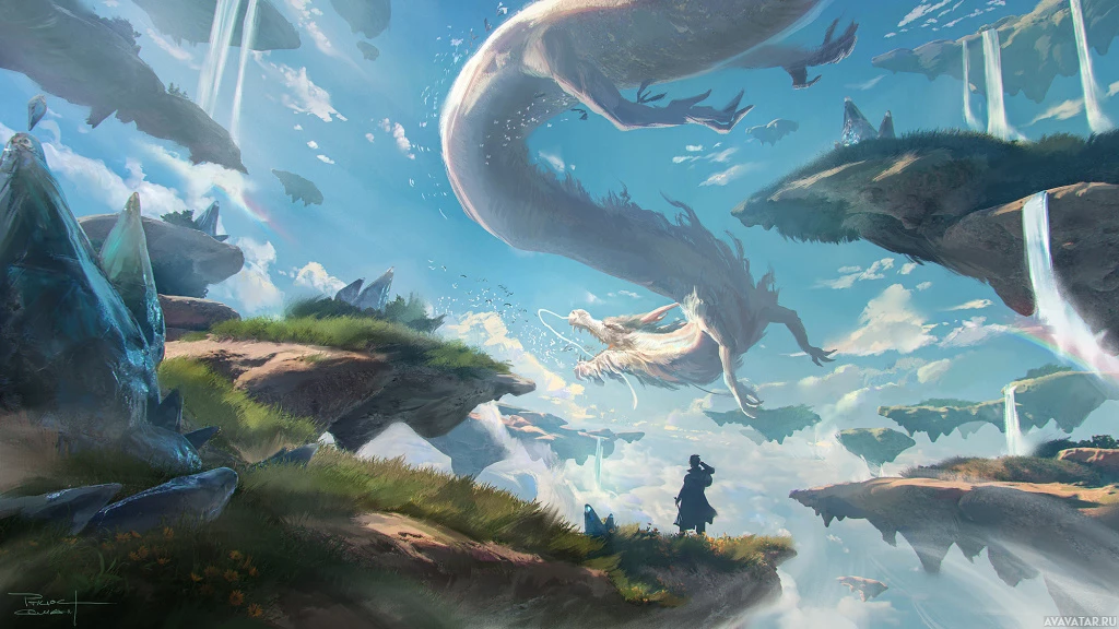 a fantasy scene with a character standing on the edge of what appears to be an island floating in the sky, surrounded by magical elements such as rainbow lightning and floating orbs. In the background, there is a grand vista of rolling hills and forests under a partly