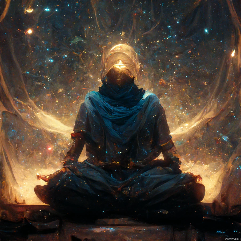 На картинке изображена фигура в медитативной позе, окруженная звездообразными элементами, создающими фантастическую космическую атмосферу. Это цифровое произведение искусства, сочетающее элементы фэнтези с духовной или мистической тематикой.