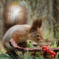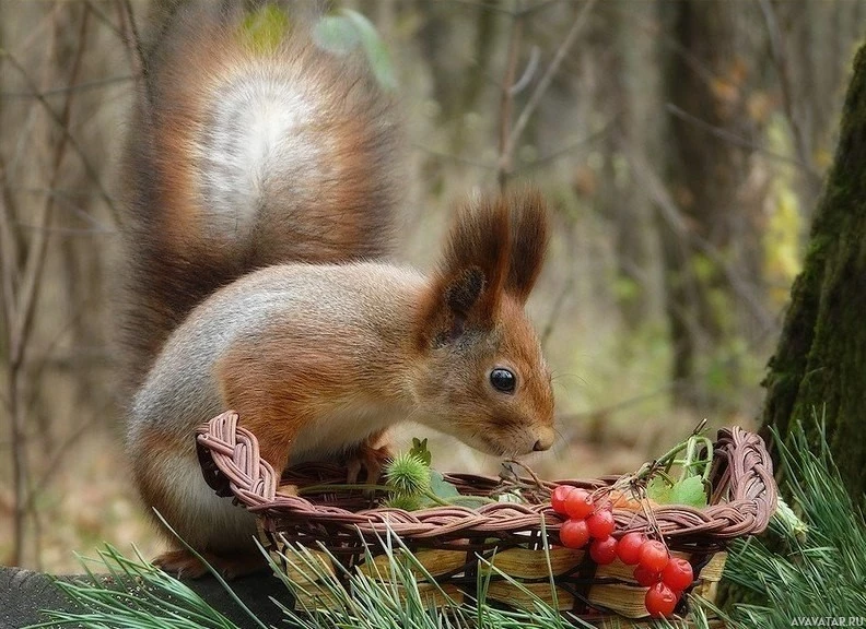 The image shows a squirrel eating from a basket filled with berries or other