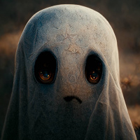 The image shows a ghostly figure with the appearance of a sheet over a person's head and two eye sockets. This character is often associated with Halloween or fantasy themes, as it represents a traditional ghost costume. The expression on the "ghost"'s face appears to be one of sadness or melancholy.