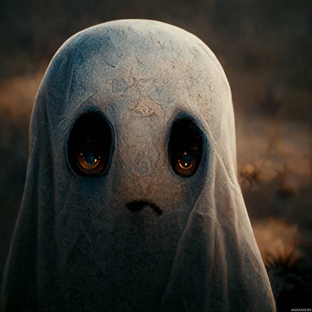 На картинке изображена призрачная фигура с простыней на голове и двумя глазницами. Этот персонаж часто ассоциируется с тематикой Хэллоуина или фэнтези, поскольку он представляет собой традиционный костюм призрака. Выражение лица "призрака" похоже на печаль или меланхолию.