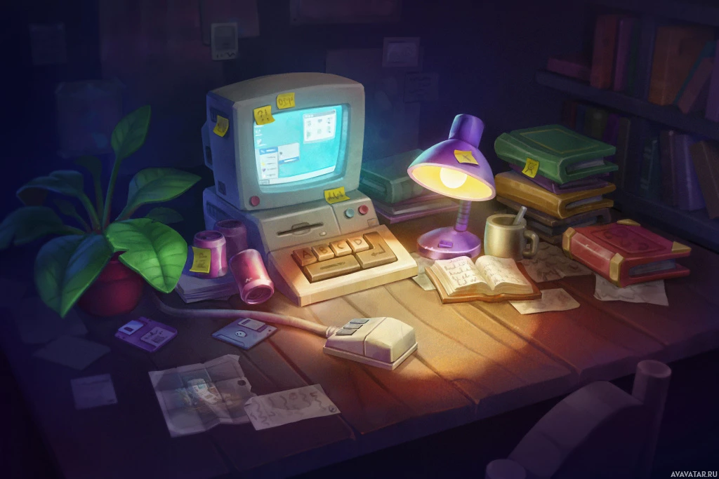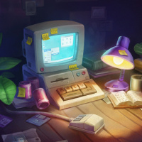 futuristic feel due to the vintage computer setup and the cluttered but somewhat nostalgic atmosphere.