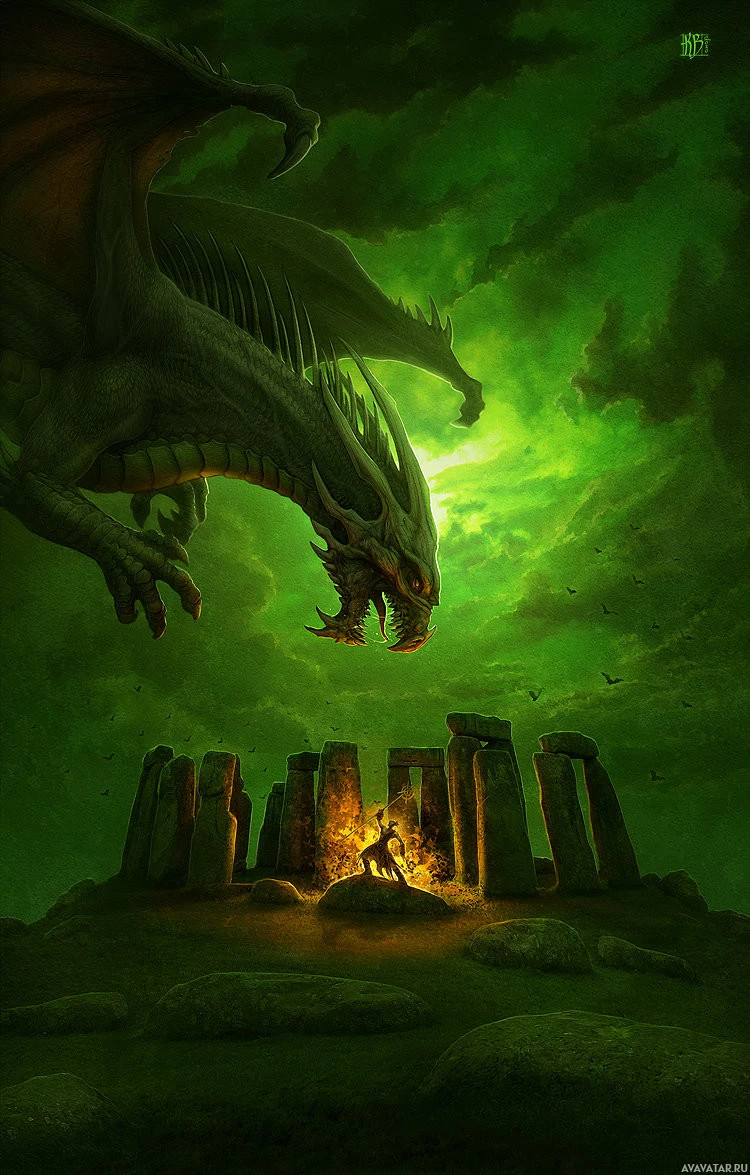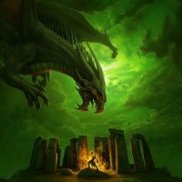 mystical atmosphere of the image. Below the dragon, there's a scene that suggests a gathering or ritual around an ancient