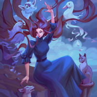 a long dress and has her hair styled in a way that it resembles flames or clouds, giving her an ethereal appearance. Around her are several animals: two cats, one