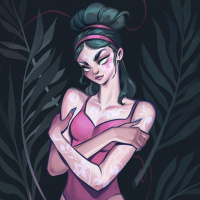 dark hair and is looking directly at the viewer with a neutral expression on her face. The overall style of the artwork is detailed and somewhat surreal, giving it an ethereal quality.