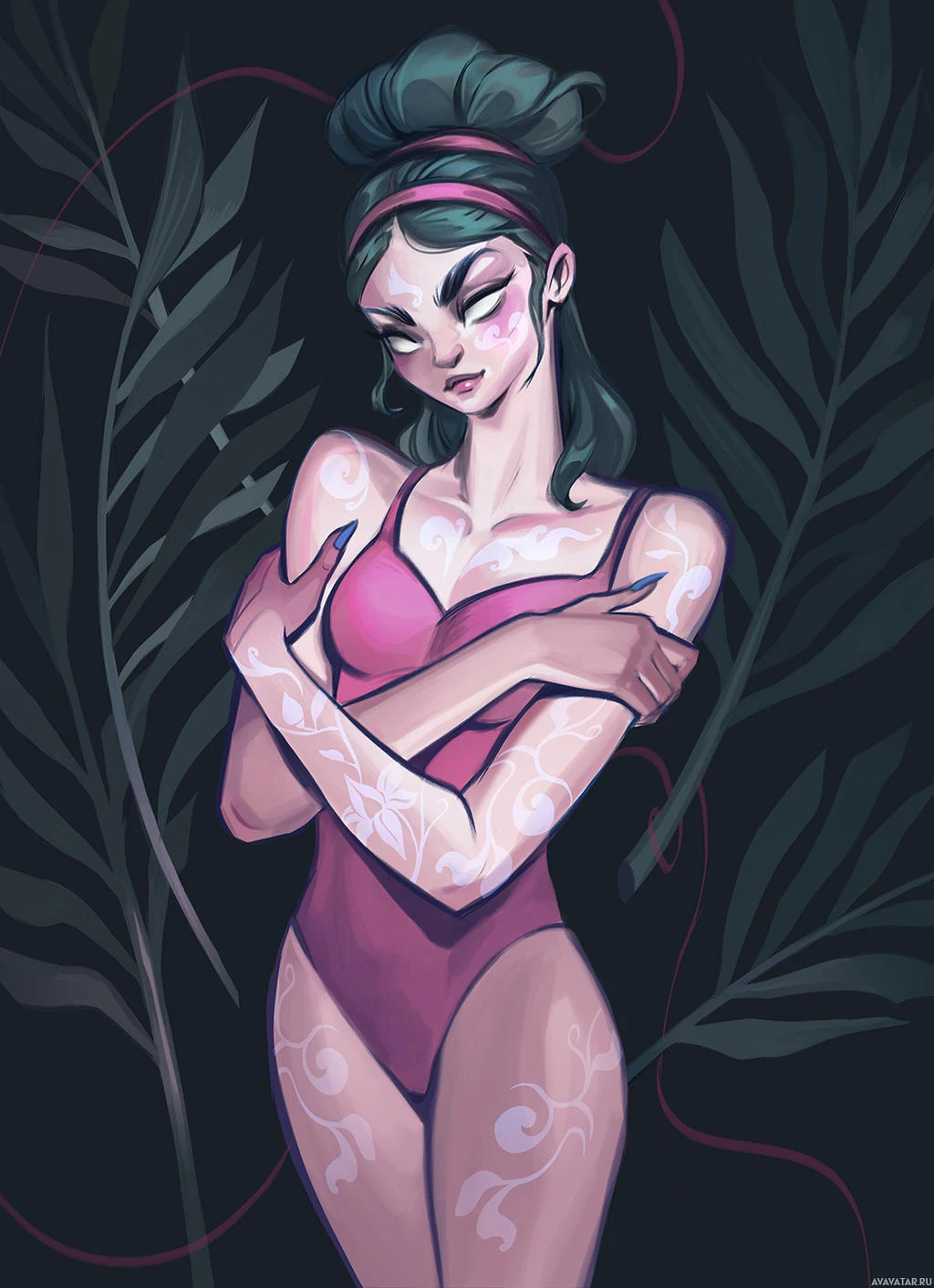 a pink swimsuit with her arms crossed, standing amidst what appears to be seaweed or aquatic plants. She has