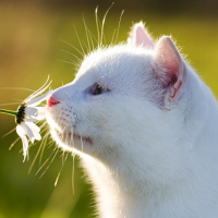 a small leaf or flower, indicating that the cat may have been exploring something nearby. The background suggests