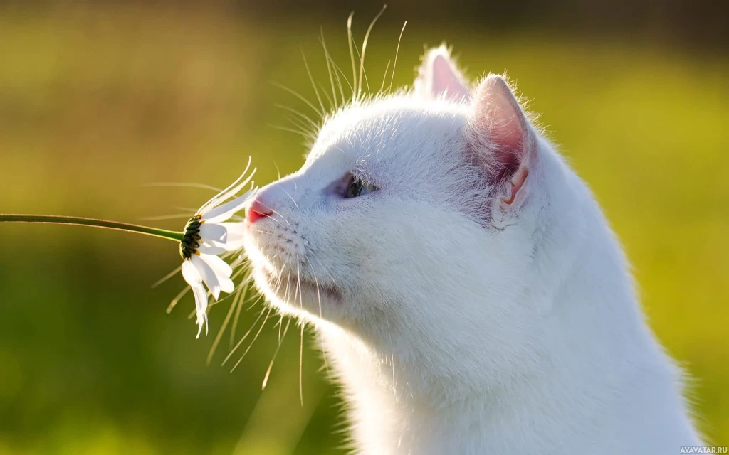 a white cat with long whiskers and a curious expression, looking up towards the camera. In its mouth, there appears to be