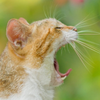 The image shows a cat with its mouth open as if it's yawning or vocalizing. It appears to be in