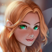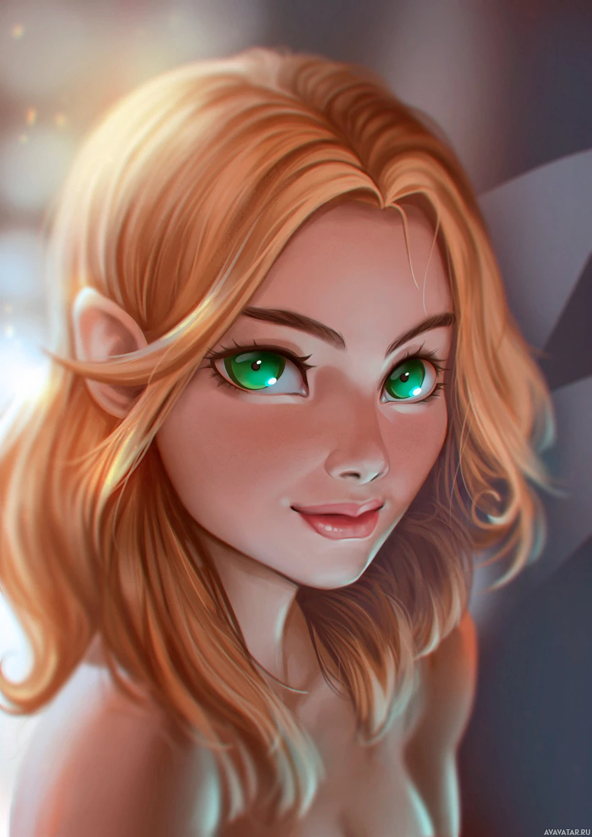 green eyes that are common features in fantasy artwork. The character is drawn with soft