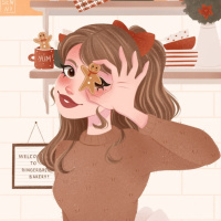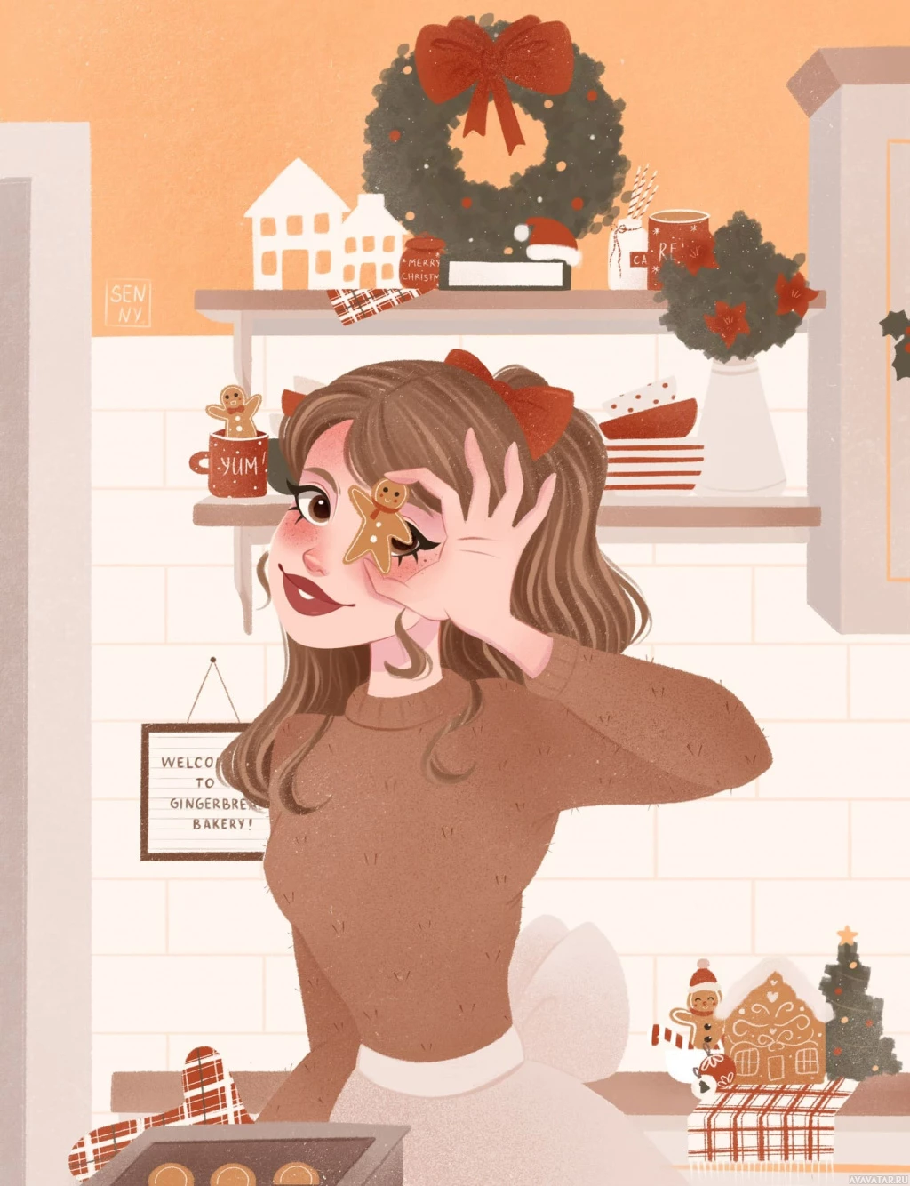 a kitchen counter in the background that seems to be set up for baking, given the presence of flour and other ingredients. The overall atmosphere conveys warmth and holiday cheer.
