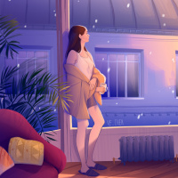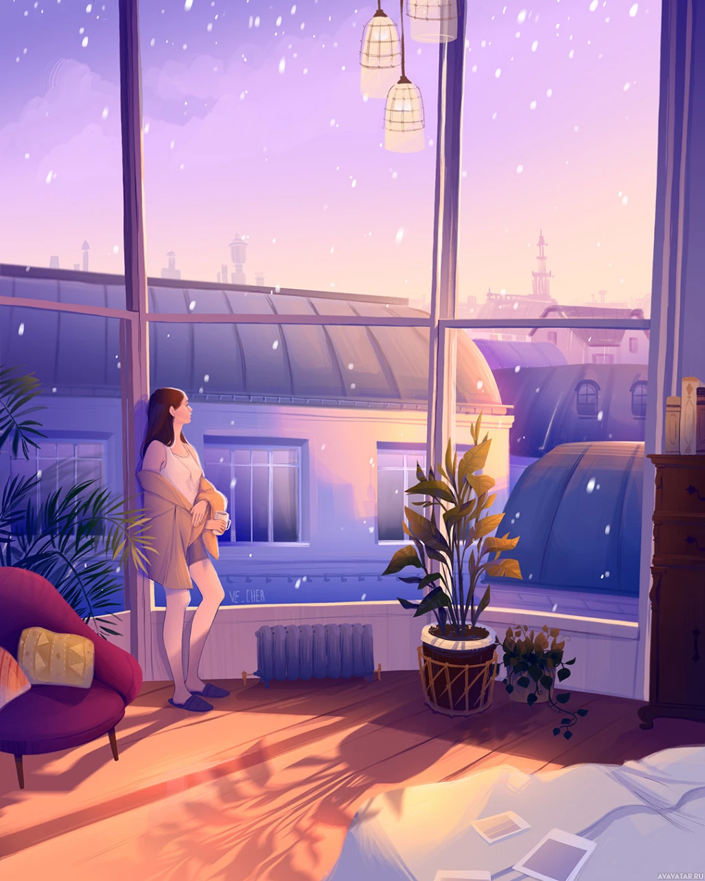 an animated girl standing by a window, looking out onto the street below. It appears to be during twilight or early evening, as indicated by