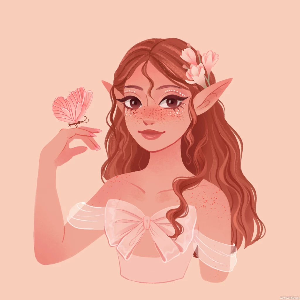 red hair, pointed ears, and is holding a flower with her hand. She also has small freckles on her face, adding to the whimsical nature of