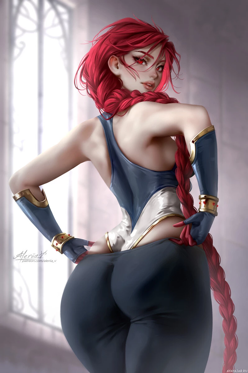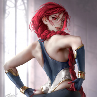 red hair and is wearing a tight-fitting costume that could be interpreted as a fantasy or superhero design, featuring elements such as straps and what appears to be armor. Her posture suggests confidence, and she's looking over her shoulder with