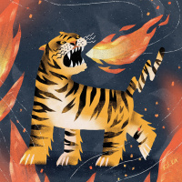 an artistic manner, with streaks and sparks emanating from the bottom of the illustration. The tiger is positioned centrally and appears to be roaring or showing its teeth, which suggests a sense of agitation or strength. The background is dark, providing contrast that makes the fire more prominent.