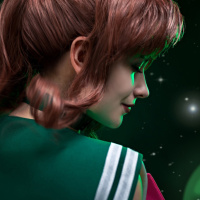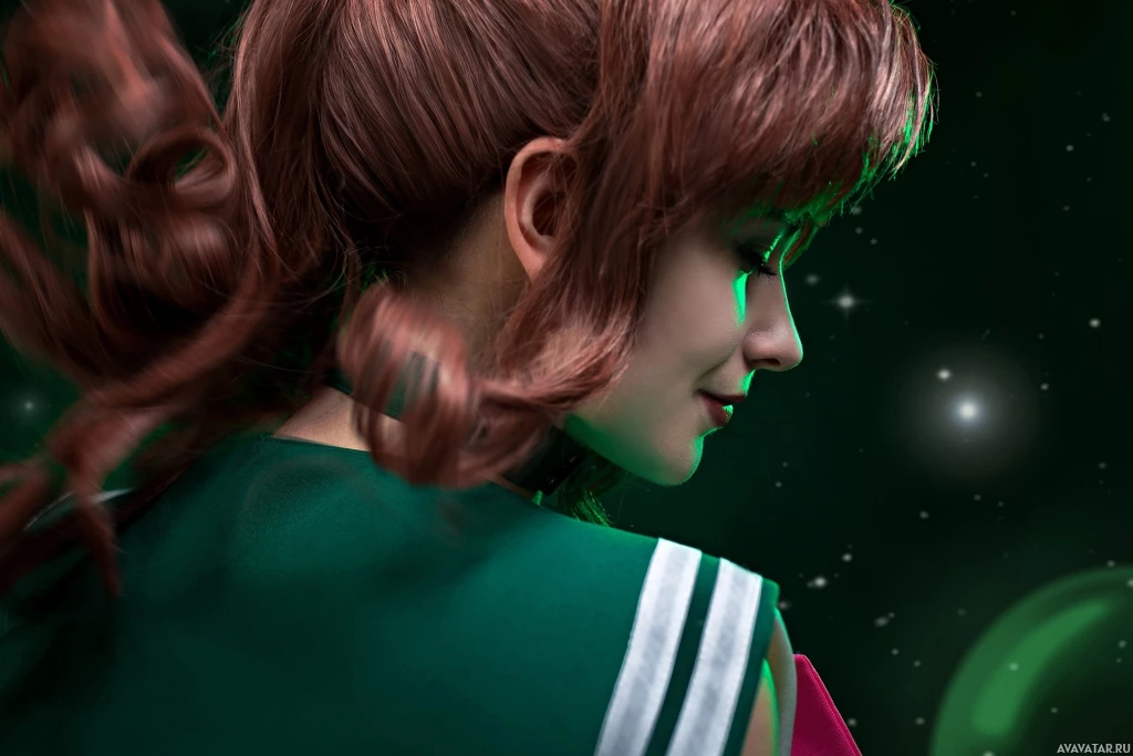 The image features a person dressed as a character from an anime. This individual is wearing cosplay attire that appears to be inspired by the style of characters from popular anime series. The person has closed eyes, which might suggest they are in a thoughtful or emotionally immersed state while portraying the character. The background has a cosmic theme with stars and nebulas, adding to the fantasy aspect of the cosplay.