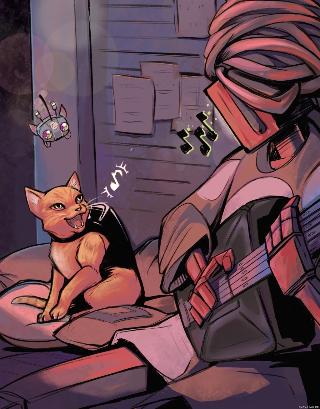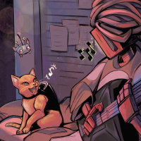an anthropomorphic cat playing a guitar while sitting on a bed. Another character, which appears to be a robot or cyborg with mechanical components and possibly