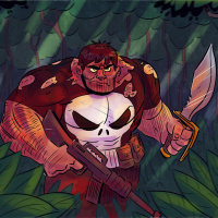 skull symbol on his chest. The overall tone of the image appears to be dark and intense, fitting for the character's