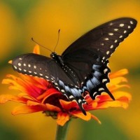 The image features a butterfly perched on top of a brightly colored flower. The butterfly has distinctive black and orange markings with