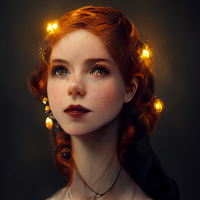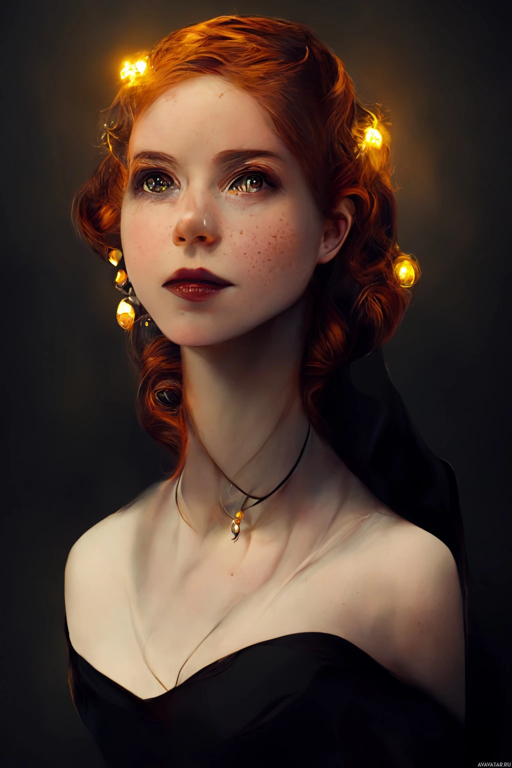 a young woman with red hair and what appears to be freckles on her face. She is wearing what seems to be a dark, possibly velvet garment or dress, which adds to the elegant and poised feel of the portrait. Her gaze is directed straight at the viewer, and she has a subtle,