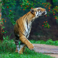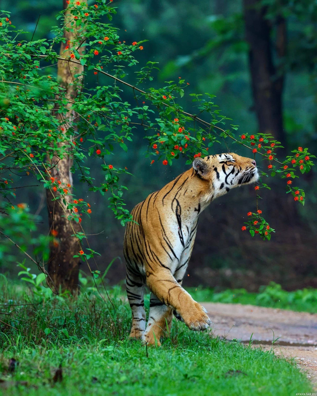 На картинке изображен тигр, прогуливающийся по густому зеленому лесу. Кажется, что тигр протягивает лапу к дереву или кусту, возможно, чтобы полакомиться ягодами или листьями. Окружающая среда выглядит как естественная среда обитания, которая могла бы удовлетворить потребности тигра.