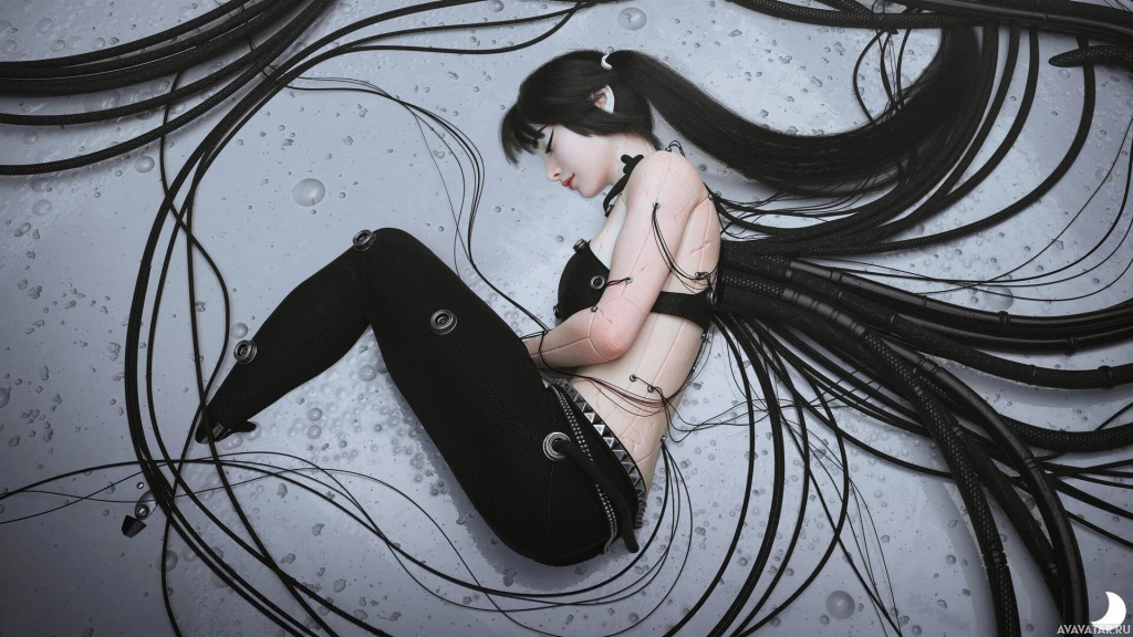 dark hair and appears to be wearing some kind of futuristic or cybernetic attire that includes what looks like wire or circuit-like patterns. This could be indicative of a theme related to technology, cybernetics, or advanced