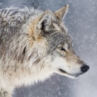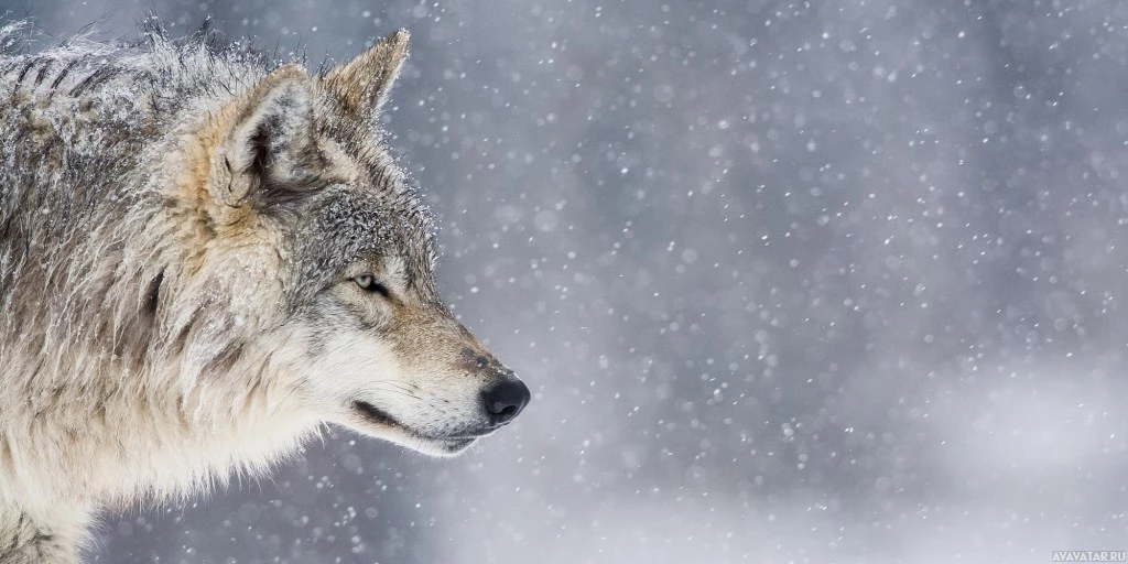 The image shows a wolf with snow falling, indicating it's either winter or