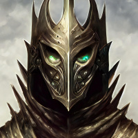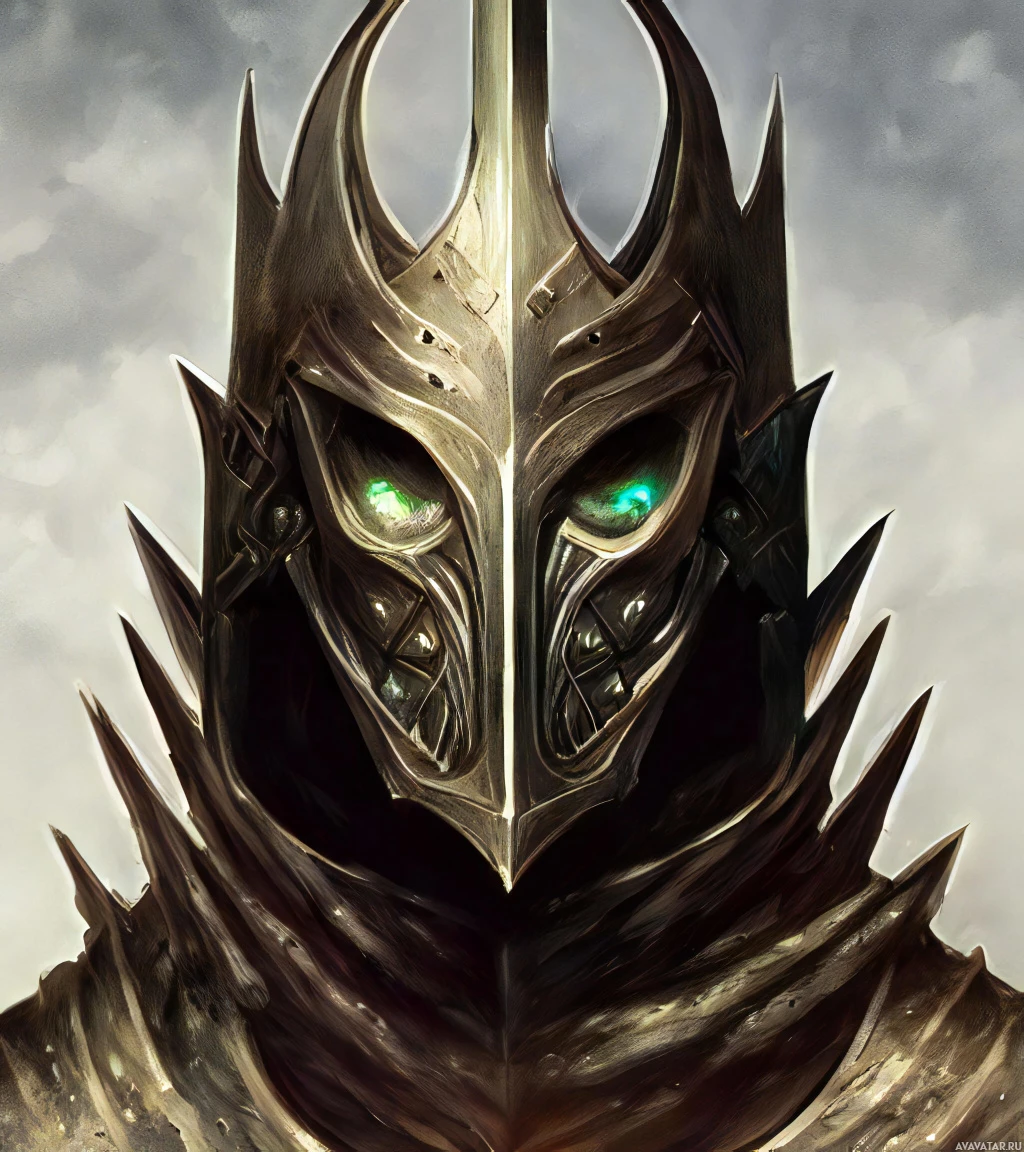 glowing eyes, which suggests an intimidating or otherworldly presence. The armor appears to be made of metal and is adorned with