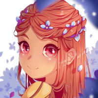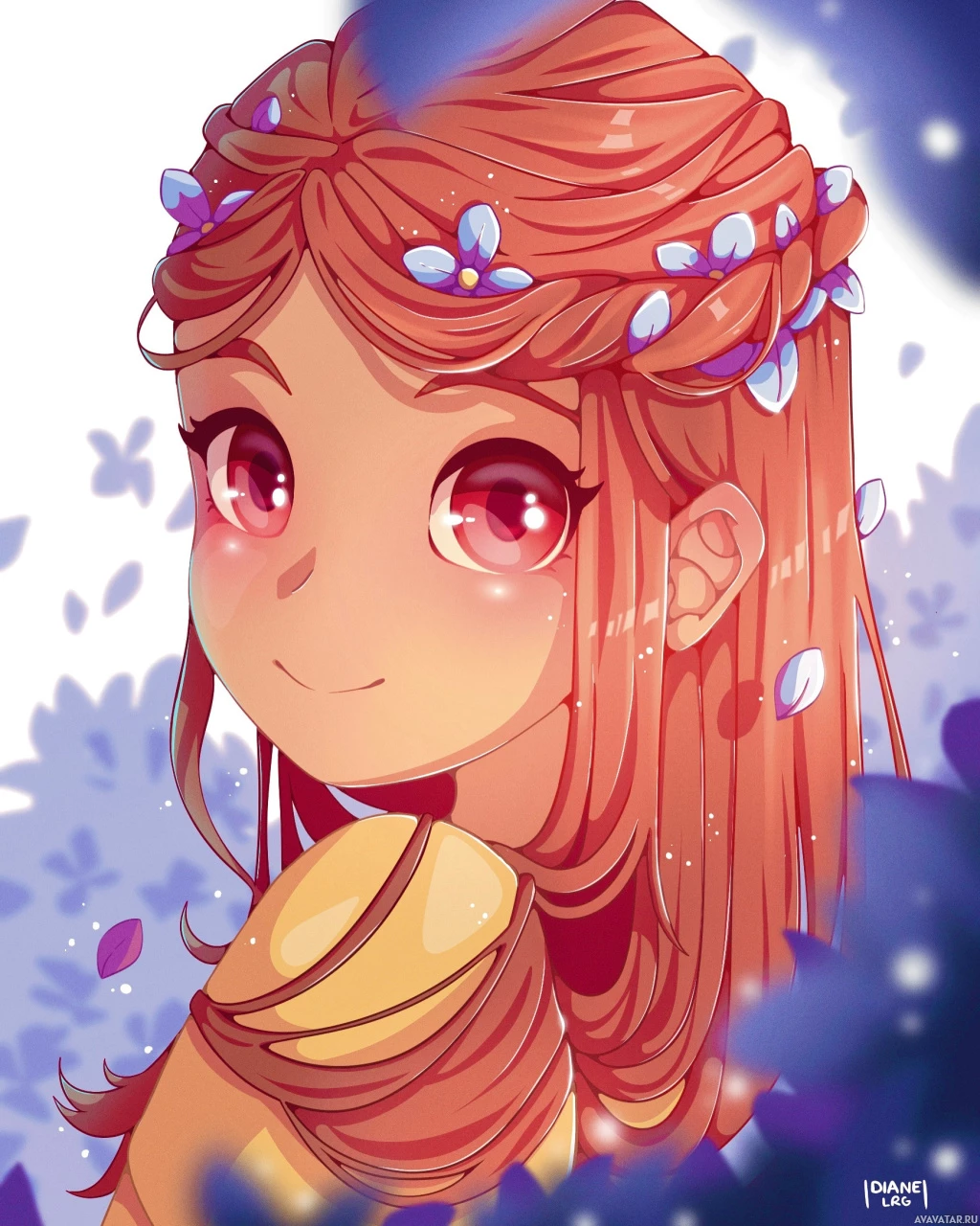 floral crown rests atop her head, adding to the whimsical nature of the illustration. The background features