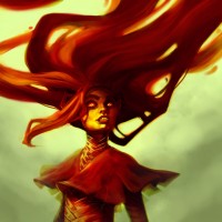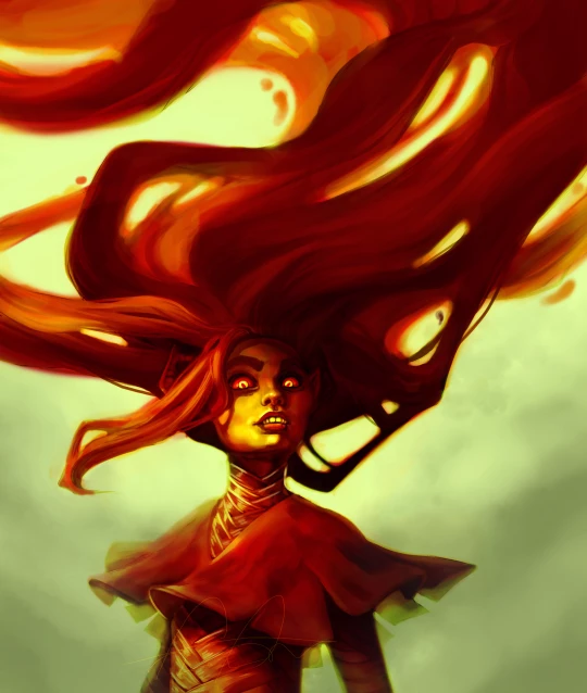 a dramatic pose, with her hair flowing behind her like flames. Her attire consists of a red garment, which could indicate that she has some sort of special status within