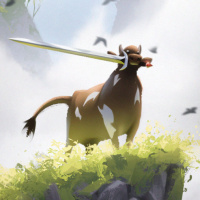 На картинке изображена корова, стоящая на скалистом выступе посреди леса. Кажется, что корова держит меч, а ее рот открыт, как будто она ревет или выражает какие-то сильные эмоции. В небе также летают птицы, что придает сцене динамизма. Общая атмосфера картины причудлива и фантастична из-за необычного вида коровы с мечом.