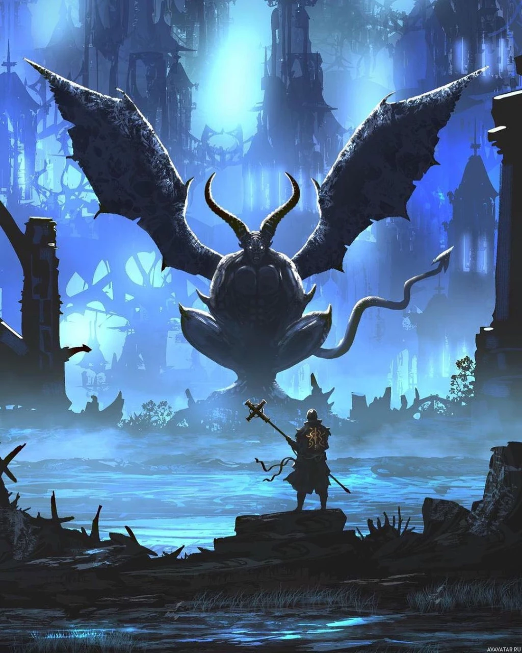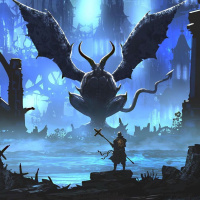 a mythical beast such as a dragon or demon with horns and wings, which gives an impression of a fearsome guardian for this domain. The background shows