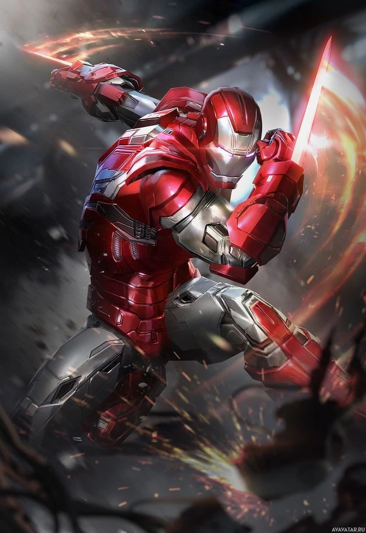 На картинке изображен персонаж в красных доспехах, известный как Железный человек. Это иллюстрация персонажа, а не фотография реального человека. Железный человек - вымышленный супергерой, появляющийся в американских комиксах издательства Marvel Comics.