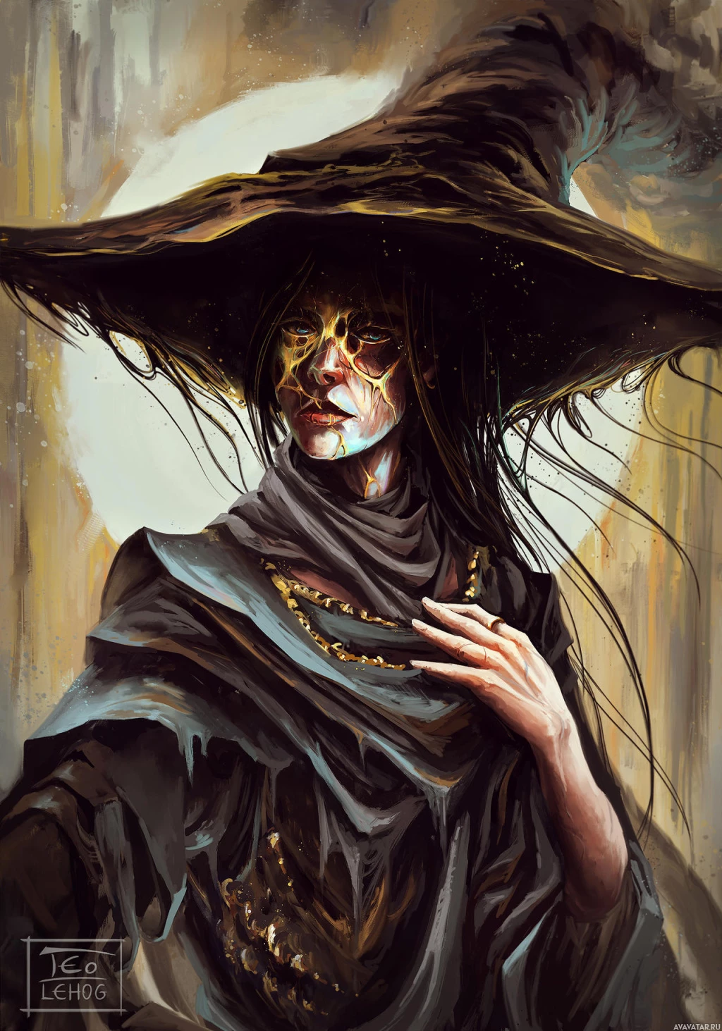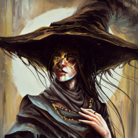 This is an artistic representation of a person dressed as a witch. They are wearing a pointed witch's hat, which is often associated with traditional depictions of witches in
