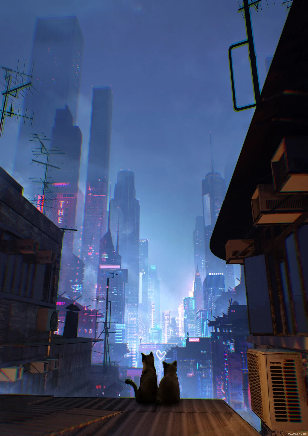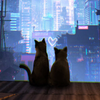 На картинке изображен кот, сидящий на чем-то вроде крыши или балкона в футуристическом городском пейзаже. Кот смотрит на огни и здания ночного города, возможно, наблюдая за окрестностями или наслаждаясь видом. Город освещен различными огнями, что наводит на мысль о продвинутой технологической среде. В целом, сцена обладает мрачным и атмосферным характером, который усиливается присутствием кошки в такой обстановке.