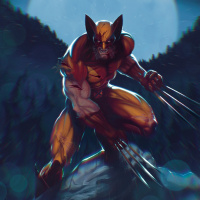 a full moon and silhouetted trees, suggesting a nighttime setting. This character is known as Wolverine due to his mutant ability to regenerate at an accelerated rate and possess