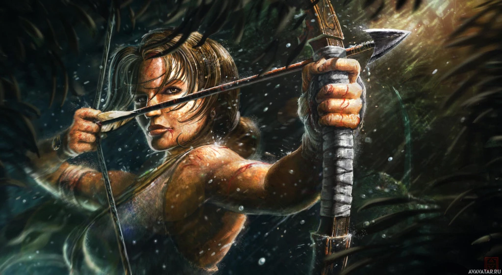 a video game who is depicted in a dynamic action pose. This character is holding a bow and appears to be ready for combat, which aligns with the description of Lara Croft from the Tomb