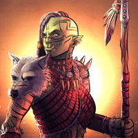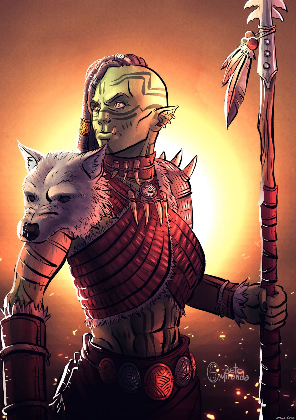 a wolf skull on her shoulder, which could signify strength or ferocity. Her attire has tribal elements, and she holds a lance in her right hand, ready for battle. The background suggests a dramatic or battle-like scene, possibly at dusk or dawn given