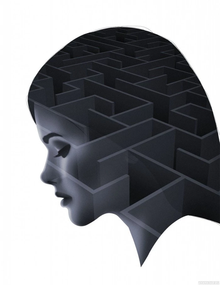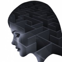 a female head, with the face and eyes closed. The head is integrated into a maze-like pattern that appears to be made up of cubes or boxes, suggesting a concept related to problem-solving, navigation through obstacles, or the complexity of
