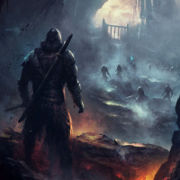 a fantasy scene with a warrior standing in the foreground. Behind the warrior, there are ruins and