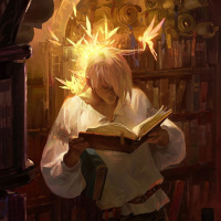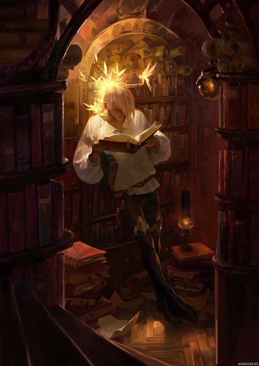 an open book that he is reading, suggesting the theme of learning or magical studies. Surrounding him are numerous books of