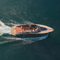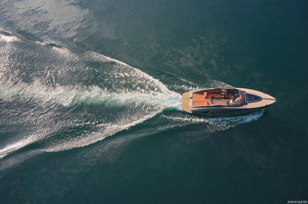 The image shows a motorboat in motion on the water. It appears to be a clear day with relatively