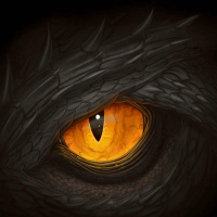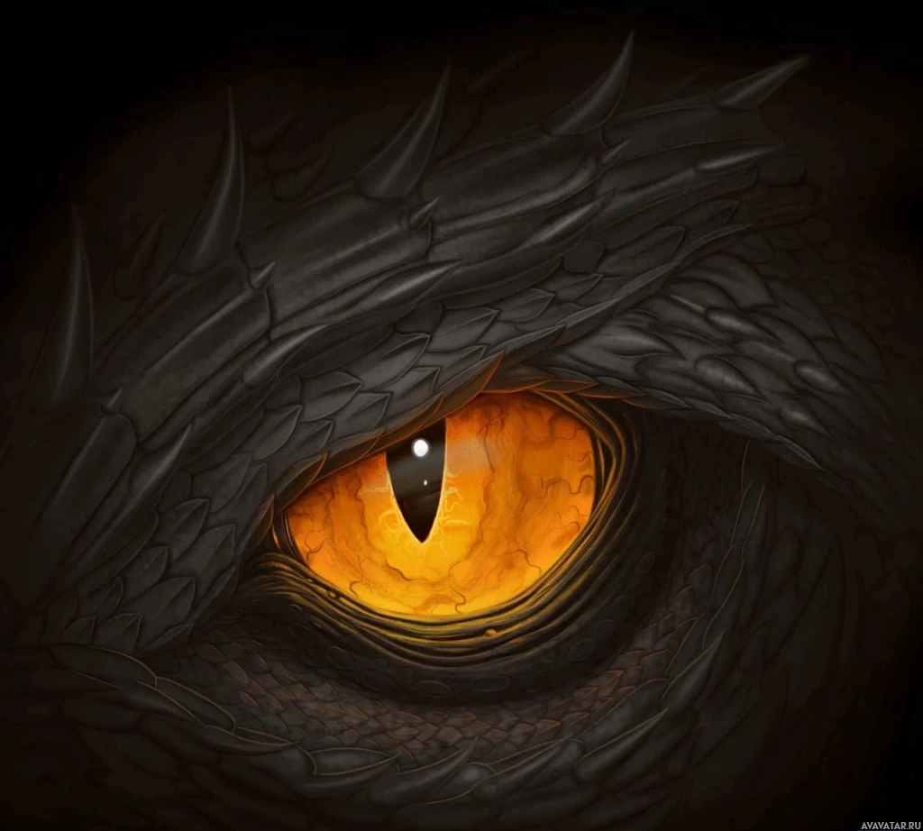 На картинке крупным планом изображен глаз фантастического дракона. Глаз детализирован, с оранжевой или желтой радужной оболочкой, выделяющейся на темном фоне морды существа. Окружающая местность покрыта чешуей, которая придает ей свирепый вид, что соответствует типичному изображению дракона в фантастических декорациях.