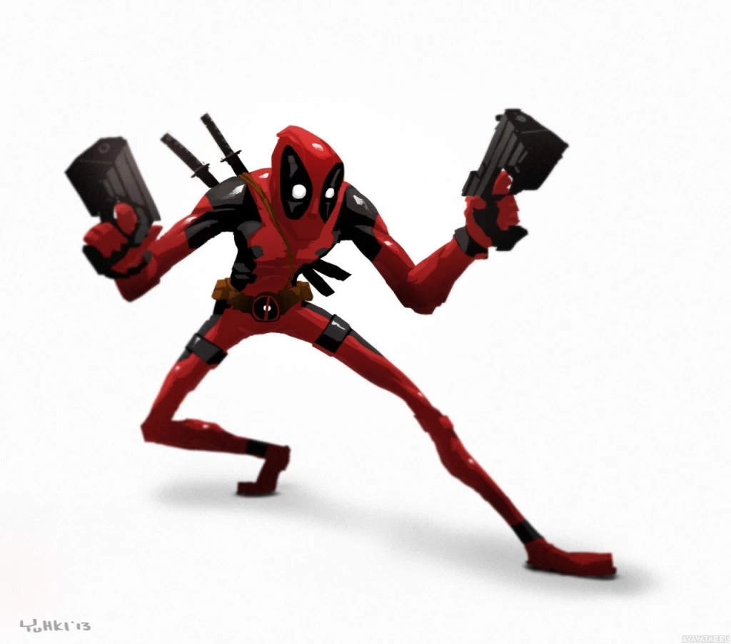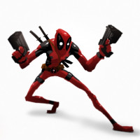 an animated character known as Deadpool. He is standing in