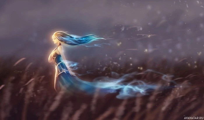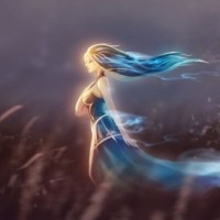 a fantasy setting, where she seems to be moving swiftly through a landscape that resembles a wheat field or tall grass. Around her, there are particles or sparks of light, which give the impression of movement or