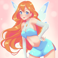 a female character with red hair, wearing fairy-like attire. She is drawn in a style that is commonly associated with anime or manga, featuring large