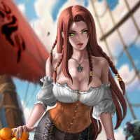 adventurer look. There are also accessories like a necklace and bracelets visible on her. In the background, there appears to be a fantasy setting that could suggest an adventure theme, possibly involving pirates, given the ship elements in the image. The artwork is detailed and colorful, giving it
