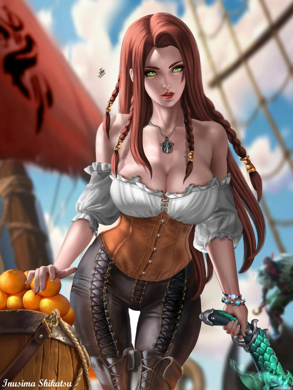 red hair and green eyes. She's wearing a top with lace-up details and high-waisted pants, which gives her a pirate or